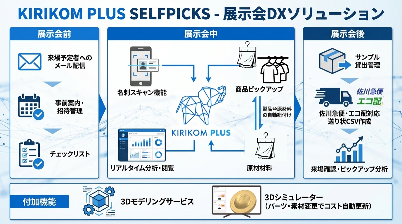 繊維業界の皆様、次回の展示会に向けた準備は進んでいますか?展示会の成功は、ブースのデザインやサンプルの質だけで決まるものではありません。実は、「どれだけ精度の高い事前案内ができるか」、そして「来場後のフォローをいかに迅速に行うか」というコミュニケーションの設計が、成約率を左右します。現在、キリコムプラスの展示会ツール「SelfPicks(セルフピックス)」では、このコミュニケーションを強力にバックアップする「メール作成・一括配信機能」を開発中です。なぜ、今「メール」が重要なのか?SNSやチャットツールが普及した現代でも、B2Bビジネス(企業間取引)においてメールは最も信頼性が高く、確実なプッシュ型メディアです。特に繊維業界においては、既存顧客への新作発表の招待休眠顧客への再アプローチ展示会直後のサンクスメールなど、タイミングを逃さないアプローチが商機に直結します。SelfPicks 新機能の3つのポイント1. 潜在顧客から来場者まで、ターゲットに合わせた一括配信SelfPicks内に蓄積された名刺データや顧客リストを活用し、次回の招待状を数クリックで一括配信。手間をかけずに、質の高い集客を実現します。2. 「反応」が見える。高度なアクセス解析を標準装備単に送るだけでなく、送信したメールが「開封されたか」「リンクがクリックされたか」をリアルタイムで解析します。もちろん、法令遵守(特定電子メール法)に基づいた「購読解除(オプトアウト)機能」も備えており、企業の信頼性を守りながら運用できます。3. 【将来展望】メールと「ピックアップ行動」の統合分析私たちが目指しているのは、さらにその先です。将来的なアップデートでは、「メールを送ったお客様が、実際にブースでどの商品をピックアップしたのか」という一連のカスタマージャーニー(行動履歴)の可視化を視野に入れています。「案内に反応してくれた方が、実際にどの生地に興味を持ったのか」が分かれば、展示会後の商談の精度は飛躍的に高まります。営業を「勘」から「データ」へこれまでの展示会運営は、担当者の記憶や手書きのメモに頼る部分が多くありました。SelfPicksの新機能は、それを確かなデータへと変えます。「誰が興味を持っているのか」を事前に把握し、「何に興味を持ったのか」を事後に分析する。このサイクルが、貴社の展示会を「コスト」から「投資」へと進化させます。開発状況や詳細なリリース時期については、引き続き本サイトにてお知らせいたします。[キリコムプラス 公式サイト]キリコムプラス | 繊維業界向けクラウドソリューション[セルフピックス 公式サイト]https://selfpicks.jp/